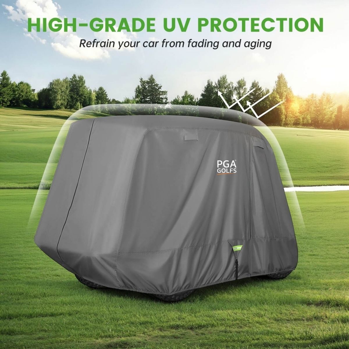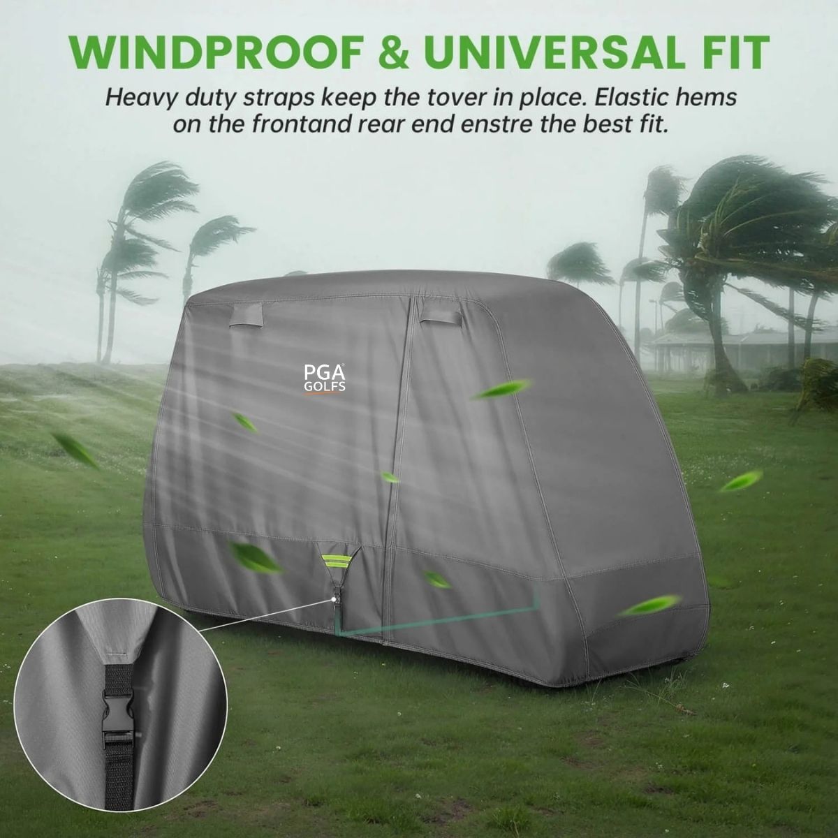 Das innovative, verlängerte Dachdesign hebt diese Abdeckung von Standardmodellen ab und bietet optimalen Schutz für die empfindlichsten Bereiche Ihres Golfcarts. Das robuste 420D-Gewebe ist besonders strapazierfähig, und die universelle Passform gewährleistet die Kompatibilität mit den meisten gängigen 2- und 4-Sitzer-Modellen.