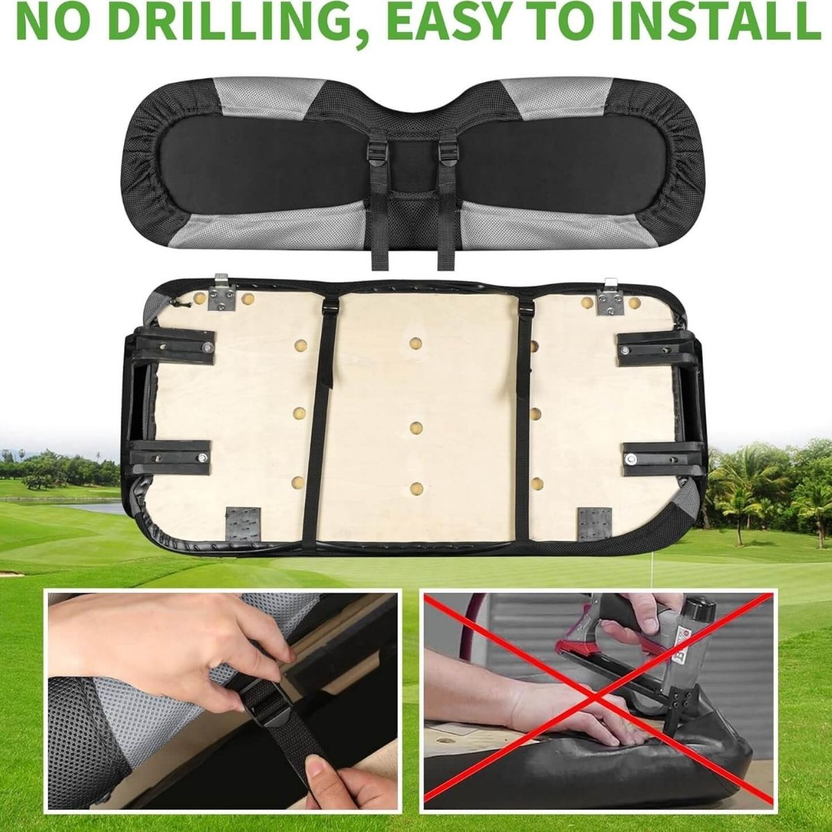 „Endlich Sitzbezüge, die tatsächlich auf meine Yamaha- und Club-Car-Golfwagen passen, ohne Falten zu werfen! Das Material fühlt sich robust an und die Rautensteppung sieht fantastisch aus. Sie haben einen verschütteten Kaffee und einen plötzlichen Regenguss ohne Flecken überstanden.“